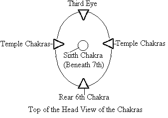 The diagram above illustrates from a view looking down at upon the top of the head. Note the four quarters. Within these are the four watchtowers of the sixth chakra. The sixth chakra behind the third eye in the middle is the center.